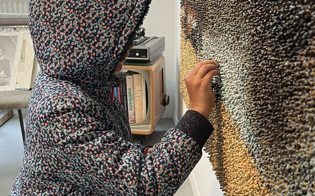 Sinds begin mei ben ik bezig met mijn meest ambitieuze kunstwerk tot nu toe: het Gezicht op Delft van Vermeer maar dan gemaakt met 110.851 kleine poppetjes. Dat is het inwoneraantal van Delft en iedere Delftenaar is welkom om zijn of haar poppetje te plakken in het kunstwerk. Ik wilde een kunstwerk maken waarin iedereen vertegenwoordigd is en we gezamenlijk een beeld vormen. De afgelopen maanden ben ik regelmatig op locatie geweest om zoveel mogelijk verschillende Delftenaren te laten mee plakken. Nu wordt het tijd om de laatste poppetjes erin te plakken. Dus als je jouw poppetje nog niet geplakt hebt en jij ook gelooft in een samenleving waarin we samen sterker staan dan alleen, kom dan op zaterdag 1 november bij mij langs in de galerie en plak tussen 1300 en 1700 je poppetje.