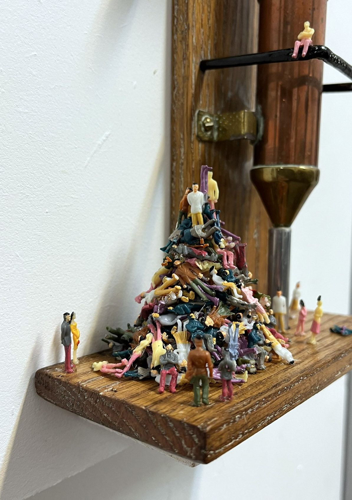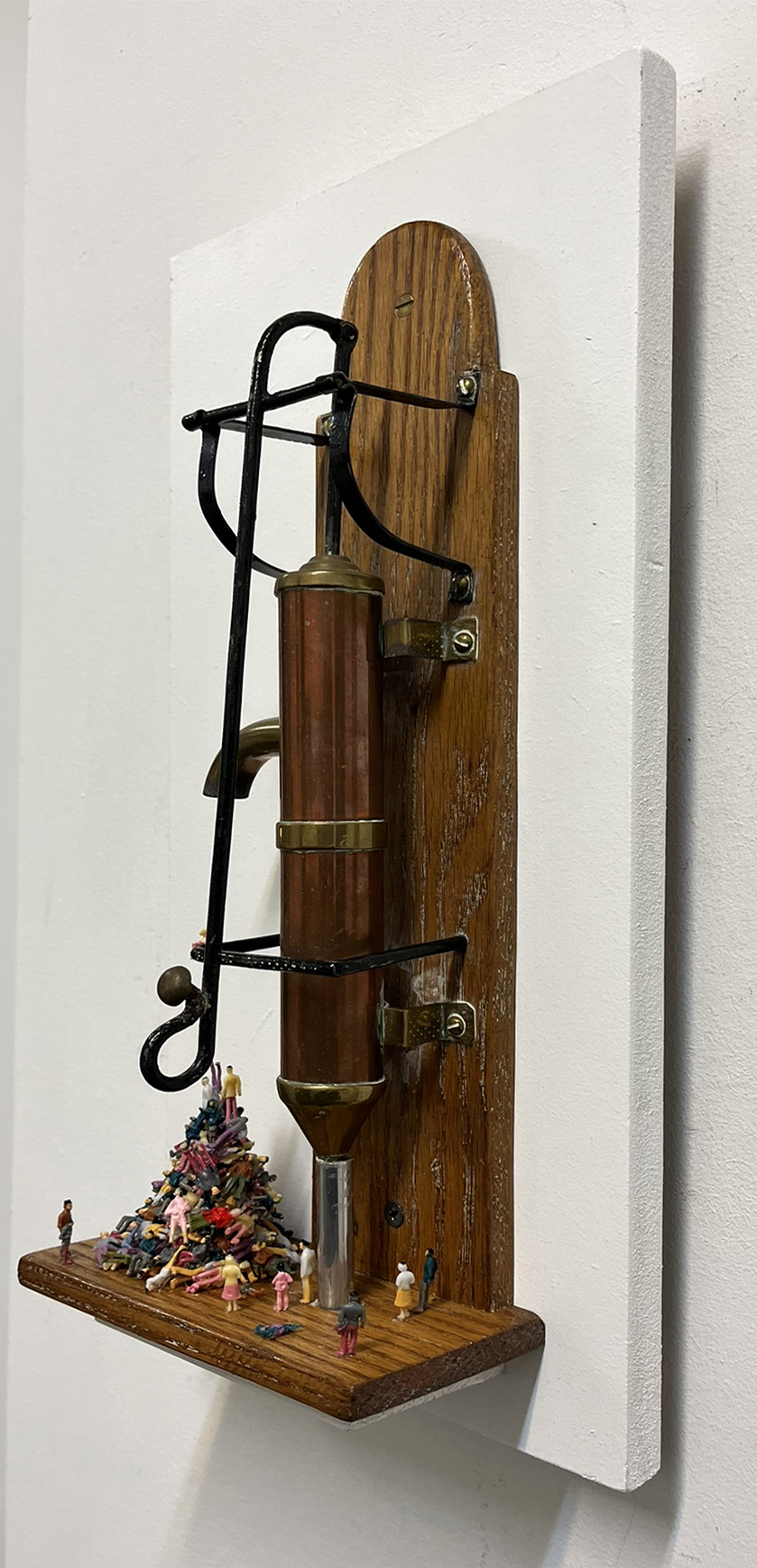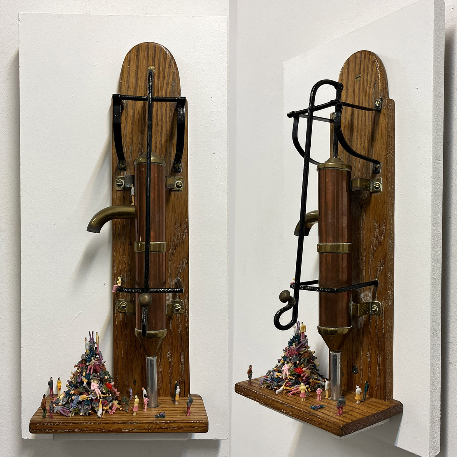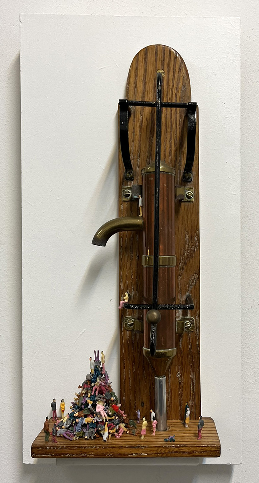Nieuw! Plastic poppetjes op vintage pomp, 21 x 40 x 8 cm. We blijven olie omhoog pompen, we blijven maar mensen erbij krijgen op deze aarde maar ooit zal er een kantelpunt komen.
