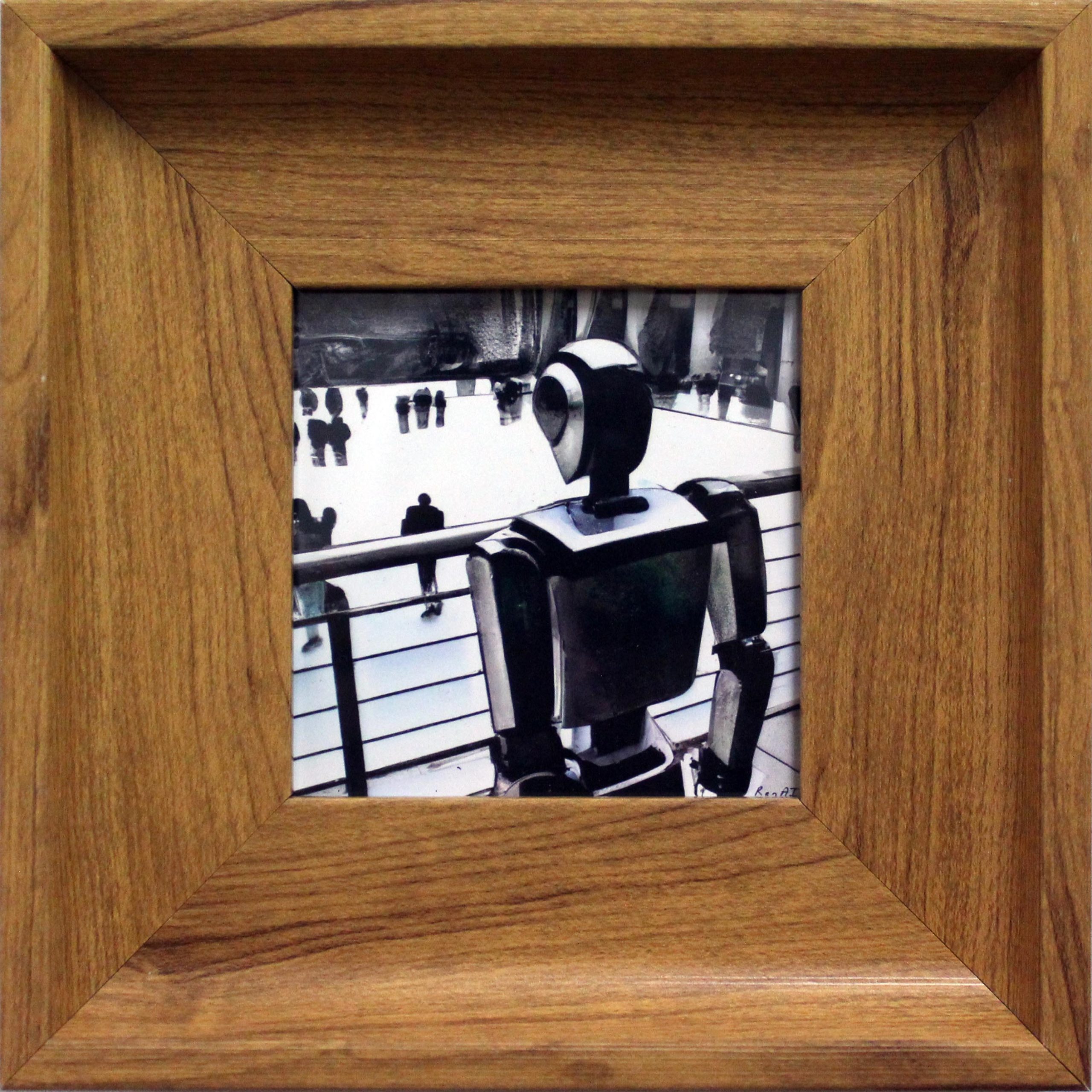 Nieuw! Digital print in frame, 18 x 18 cm. Bedacht door mij maar deels gemaakt in AI: een trieste robot die een blik werpt op de schaatsers van Rockefeller center. De eerste schaatsende robot is immers nog ver weg. In mooi houten lijstje, gelimiteerde serie van 5, gesigneerd door RenAI, mijn nieuwe AI lijn.