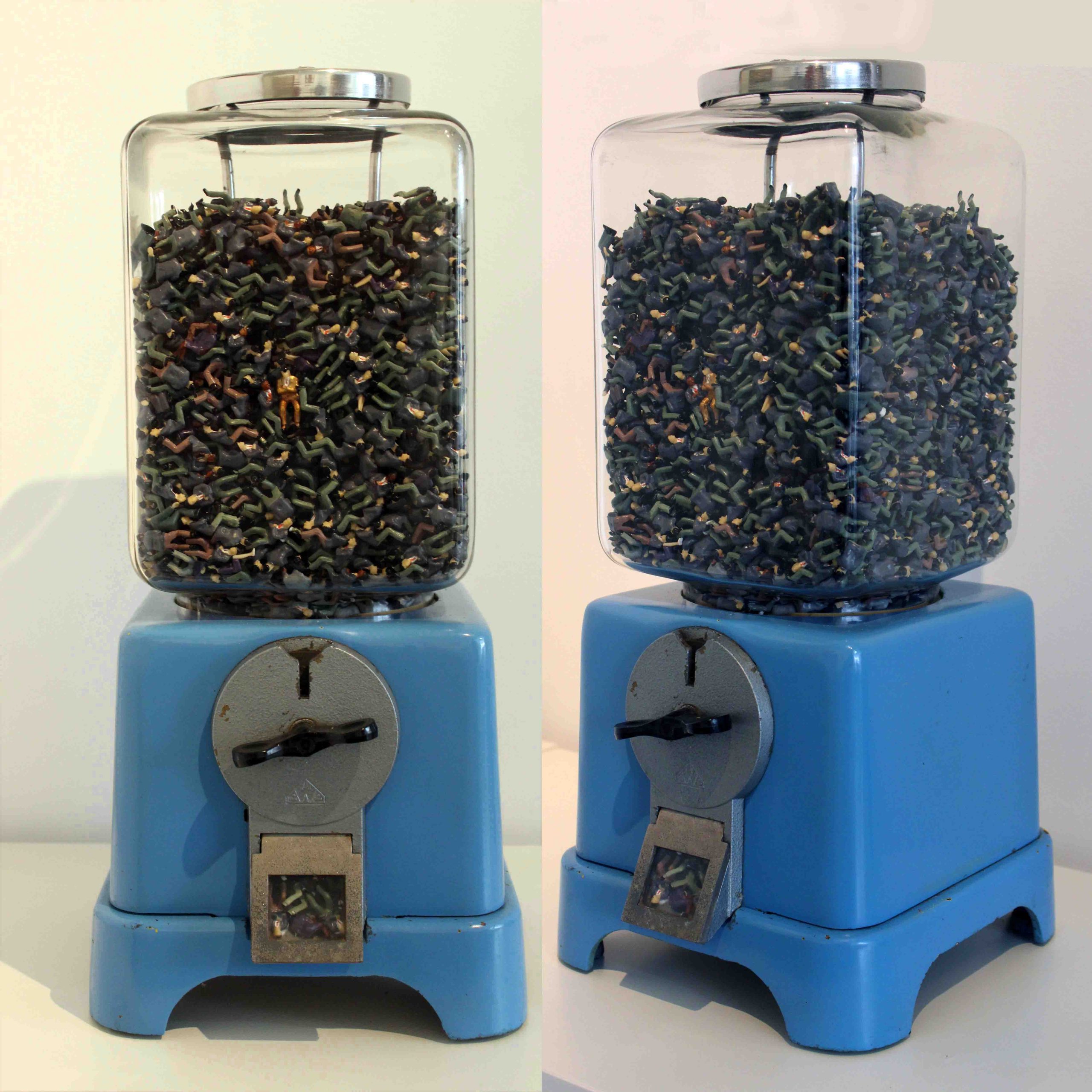 Nieuw! One in a million, plastic poppetjes in vintage kauwgom ballen automaat uit de jaren 60. We zijn altijd op zoek naar die ene unieke persoon die uitsteekt boven de grijze massa. Gezien de zwaarte van het object in combinatie met glas durf ik dit object niet te verzenden.