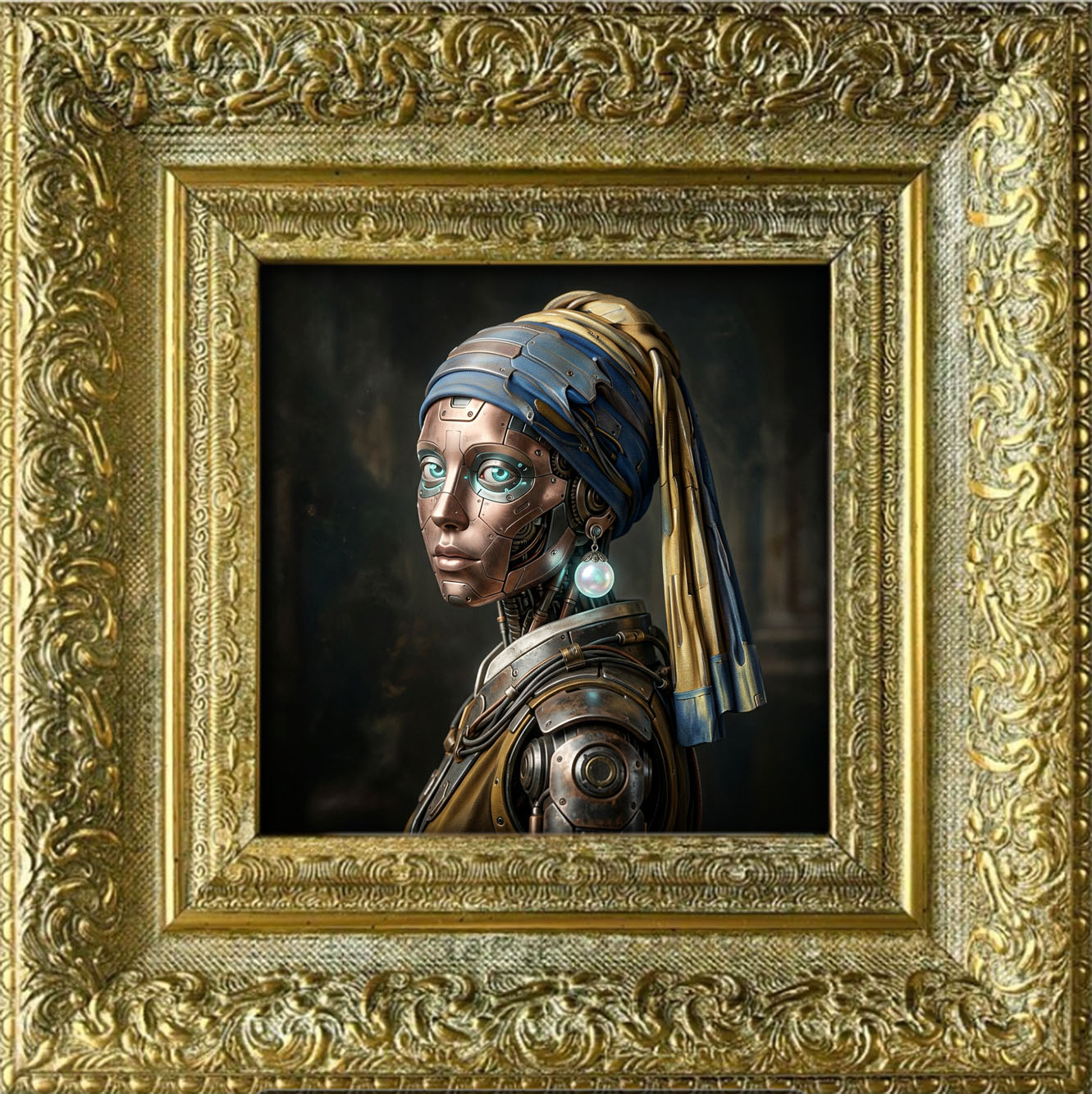 Nieuw! 19 x 19 cm. Digitale print in lijst, Meisje met Parel van Vermeer als futuristische robot, present meets past.