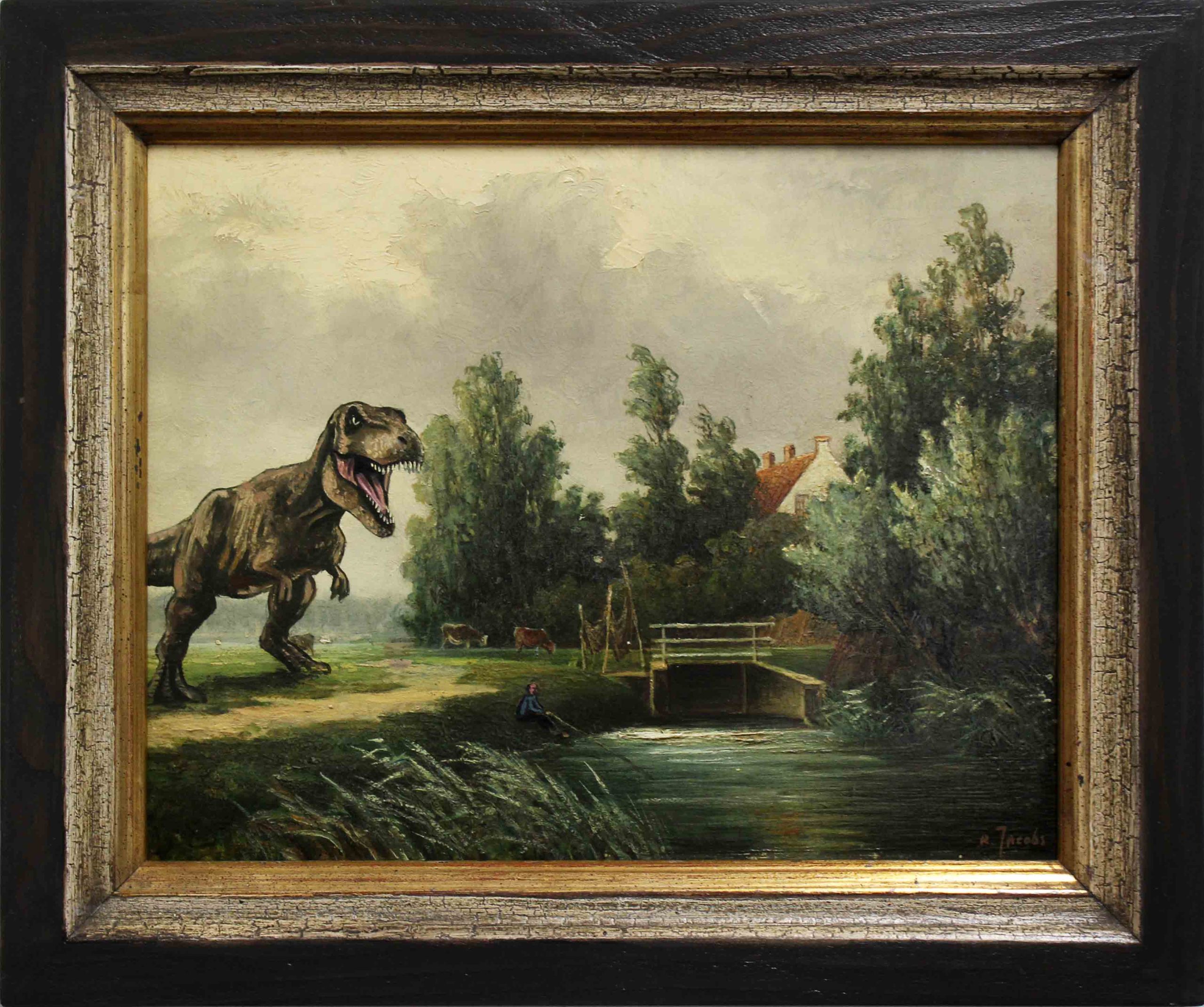 SOLD! De visser (die enige gelijkenis met mijzelf vertoont) staart zo ingespannen naar zijn dobber dat hij de T-rex die in zijn rug is opgedoken over het hoofd ziet. Zoekt u een soortgelijk werk, neem dan contact met mij op: info@artjacobs.nl.